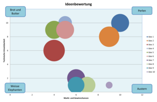 Wir verbinden in Ihrer Ideenfindung die internen Quellen (Ideenmanagement) und die externen Quellen (zB Lead User). Sie steigern Quantität und Qualität Ihrer Ideen. Wir unterstützen sie bei der Bewertung mit erprobten Werkzeugen von einfachen Scoring-Modellen bis hin zu finanzwirtschaftlichen und wahrscheinlichkeitstheoretischen Modellen (zB Monte Carlo Simulation).